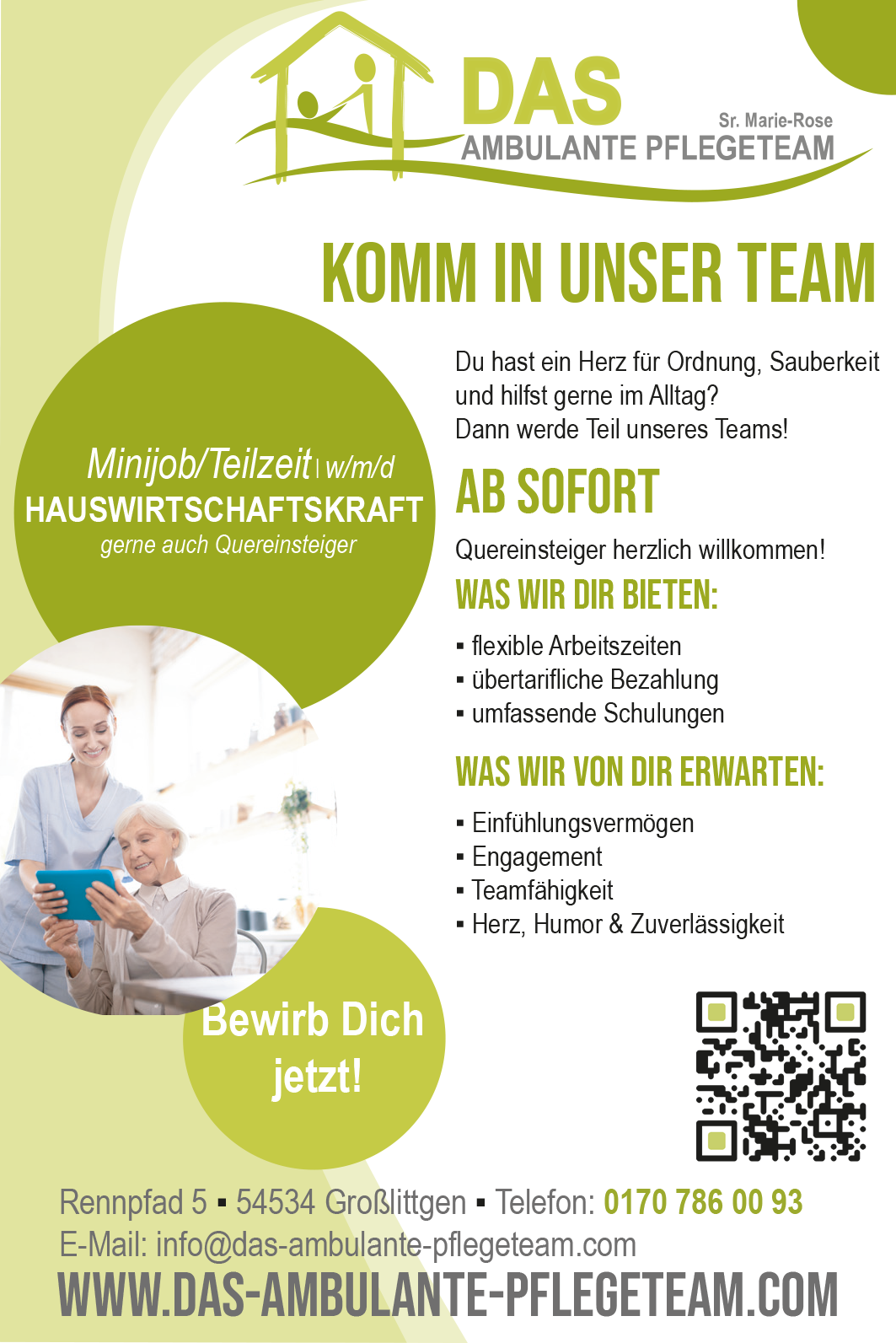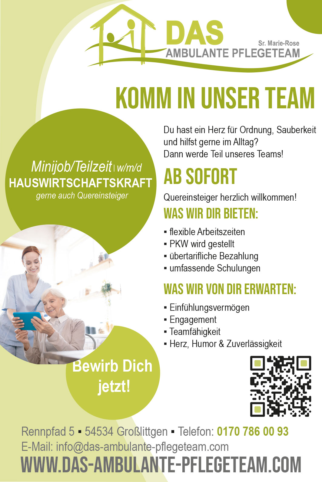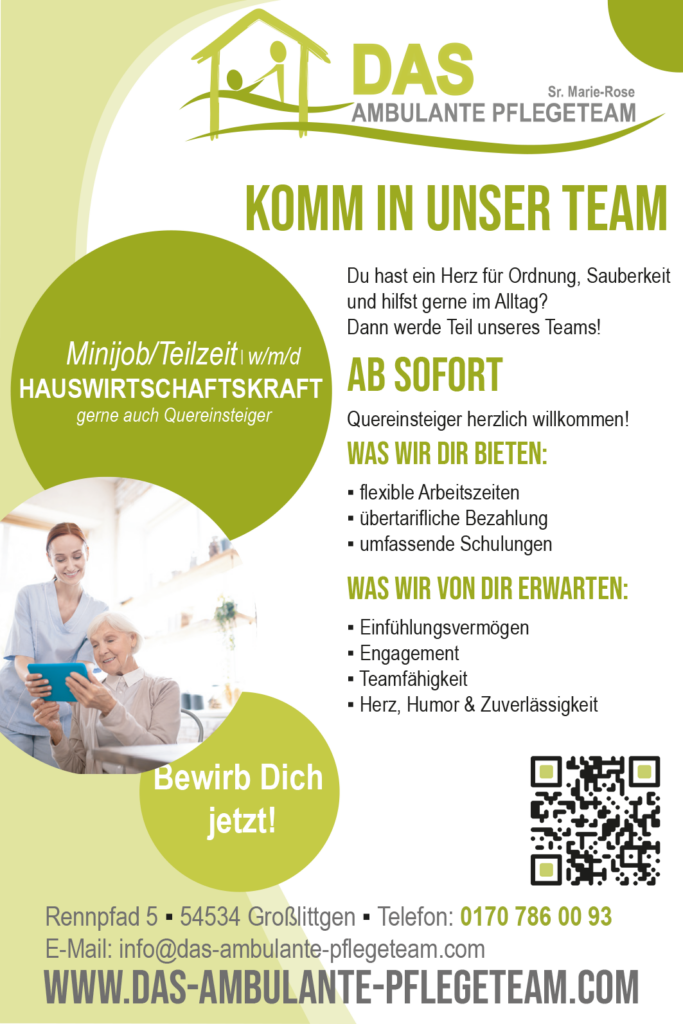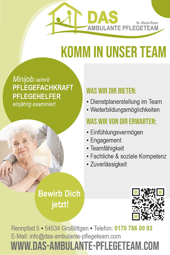 DAS ambulante Pflegeteam bietet Ihnen die Möglichkeit, Ihre fachlichen Fähigkeiten einzubringen und gleichzeitig den Menschen in unserer Region ein Stück Lebensqualität zu schenken.
